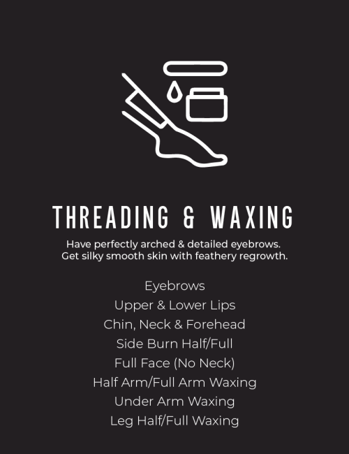 We specialise in threading and waxing for eyebrows, upper & lower lips, chin, neck, forehead, side-burn (half/full), full face, half/full arms, underarms, half/full legs—all delivered with precision.